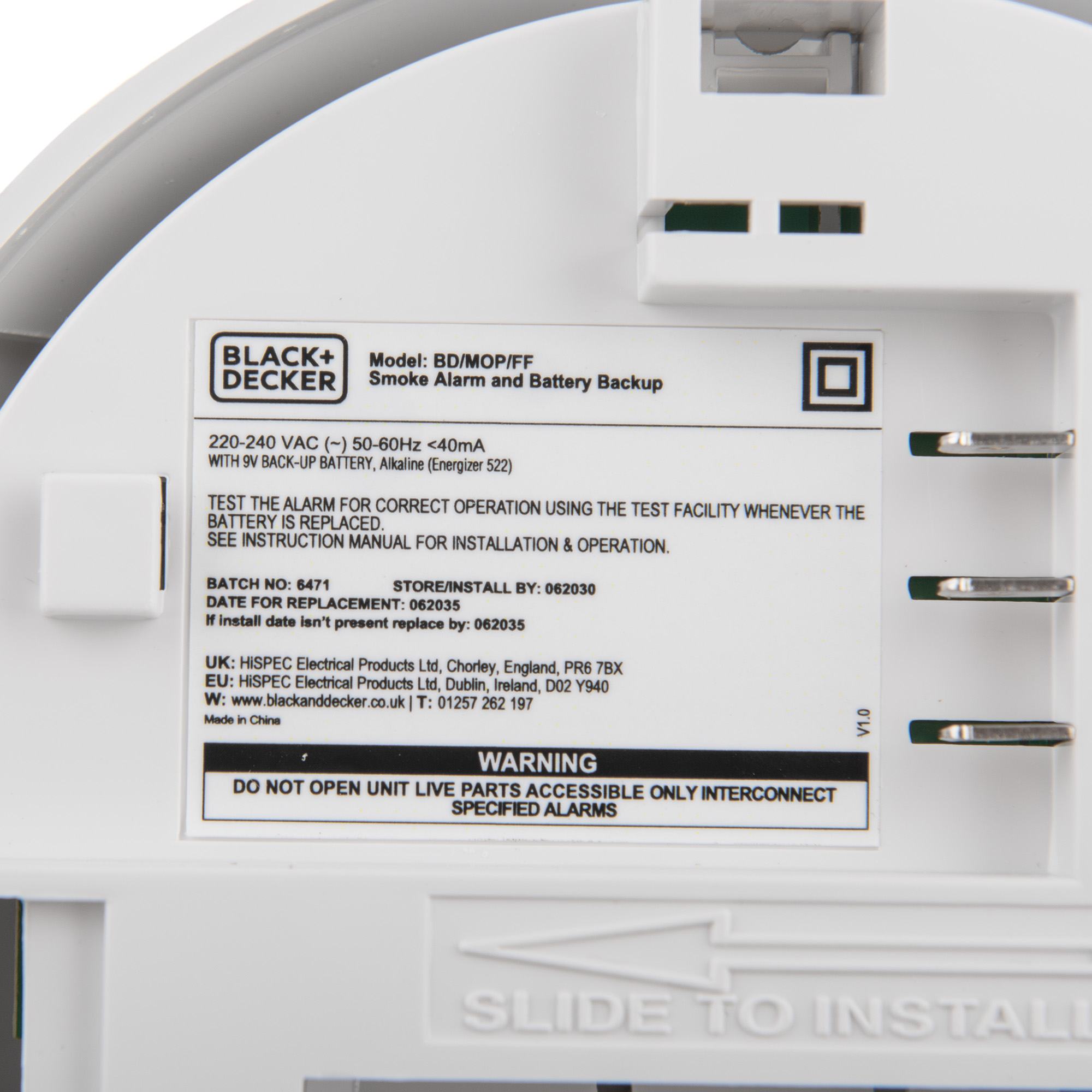 The mains powered smoke alarm from BLACK+DECKER, is an optical smoke alarm with a 9v replaceable battery backup. Suitable for Grade D2 installations, you can provide plenty of warning to a fire with an interlinked system of up to 20 compatible devices. Featuring a Fast Fix base, provides a quick installation as well as simple replacement after 10 years.
