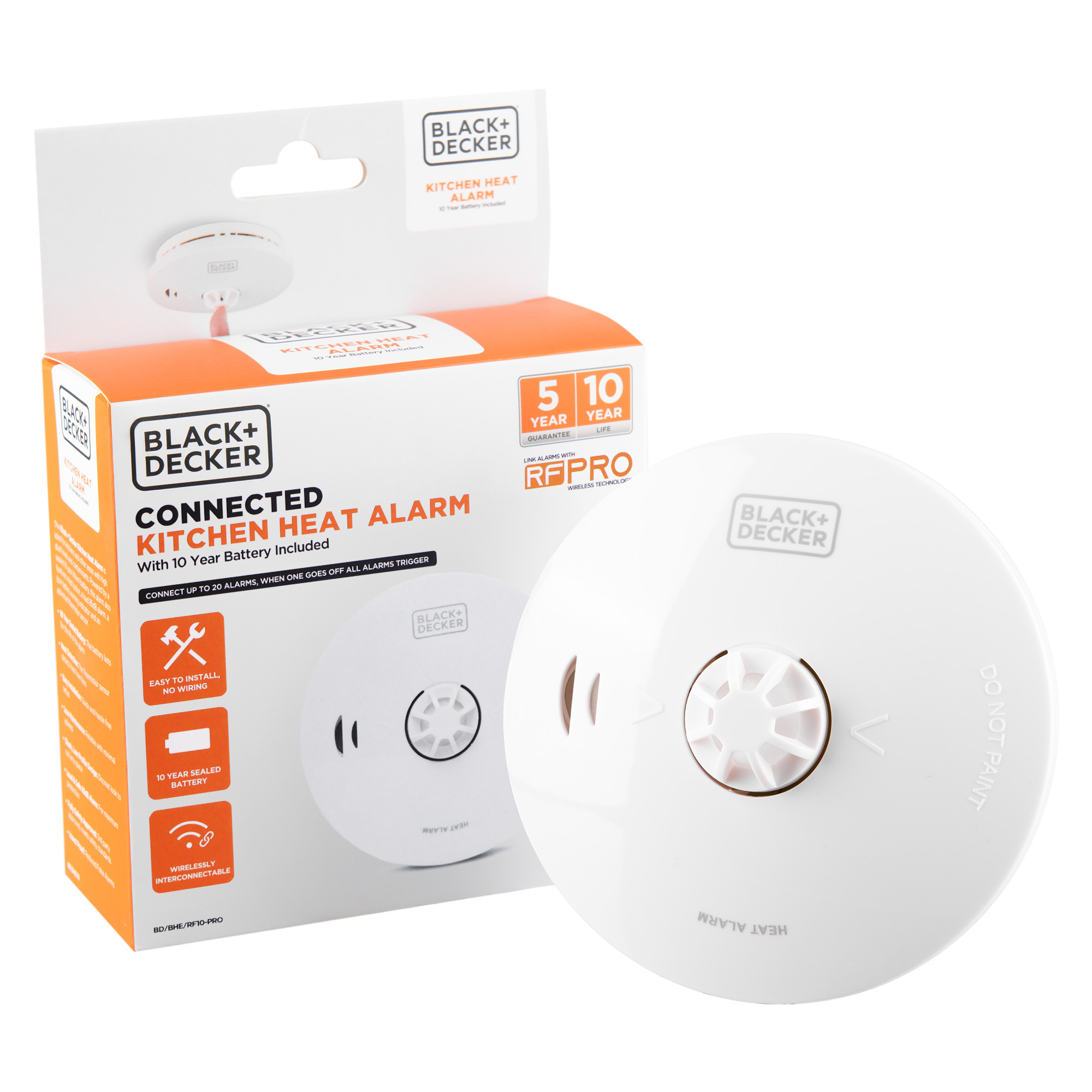Easy to install and unobtrusive with no wiring required, this alarm bundle from BLACK+DECKER provides essential fire detection for your home. The kit comprises of 2 optical smoke alarms and 1 heat alarm, capable of radio-interlinking with each other. Easy weekly testing of your whole system can be performed by pressing only one test button in your interlinked system, allowing all alarms to sound.